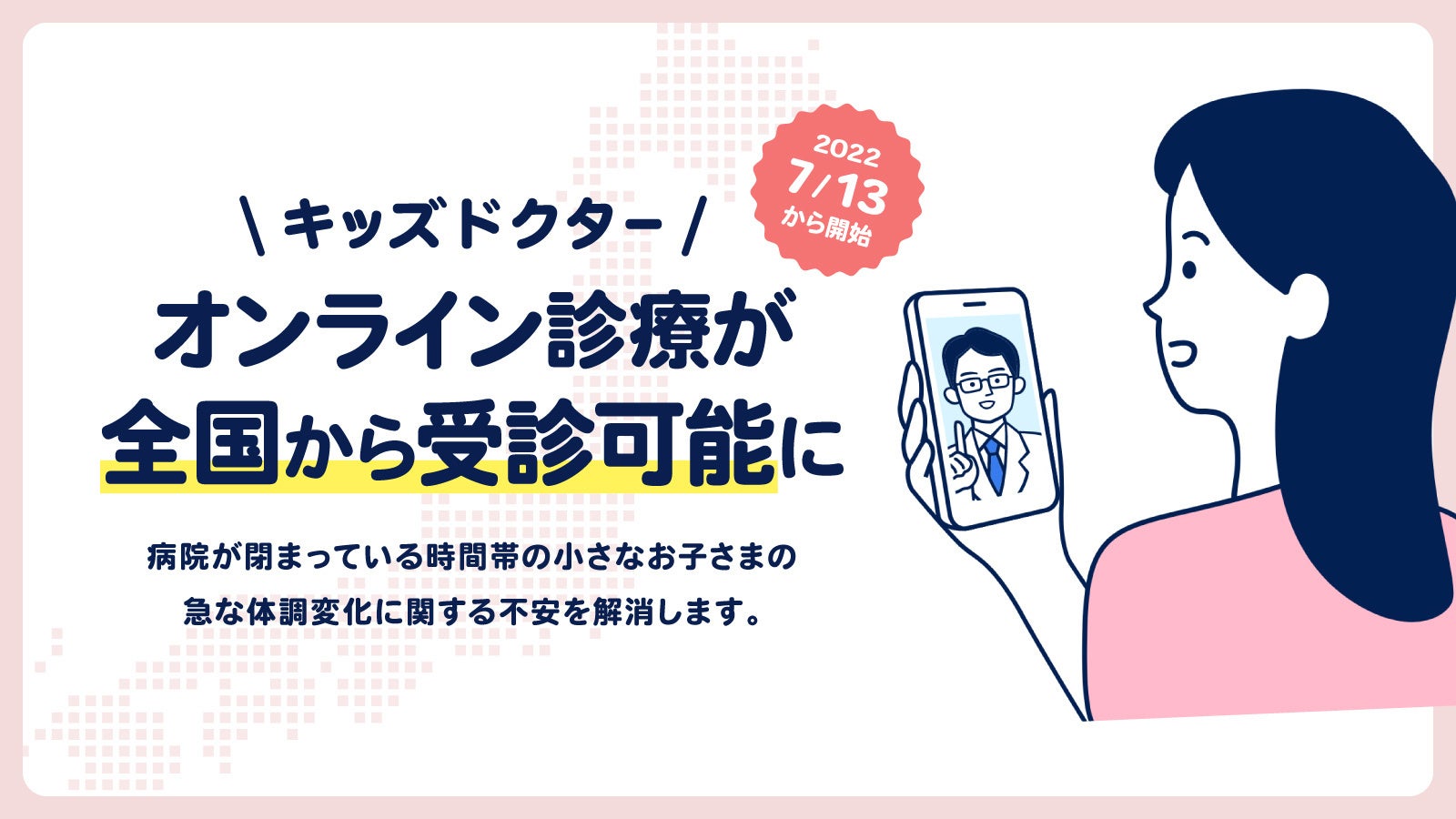 そうした状況を受け、キッズドクターでは、これまで関東一都三県にてオンライン診療予約サービスを展開しておりましたが、今回より多くの親御さんの不安を少しでも和らげられるよう、医療機関と提携し、オンライン診療予約の提供エリアを全国へ拡大するに至りました。